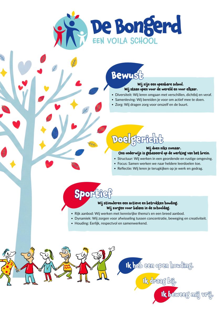 Wij leren kinderen omgaan met diversiteit. In de klas, in de buurt, in het land en in de wereld. Wij leven voor dat wij zorg dragen voor onszelf en onze leefomgeving. Onze kinderen brengen beweging in de buurt.
